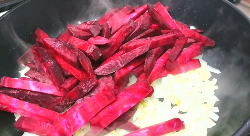Obrane buraki pokrój w paski. Obraną cebulę pokrój w drobną kostkę. Cebulę podsmaż na oleju po chwili dodaj do niej buraki. Zmniejsz ogień i mieszając od czasu do czasu smaż przez 10 minut.