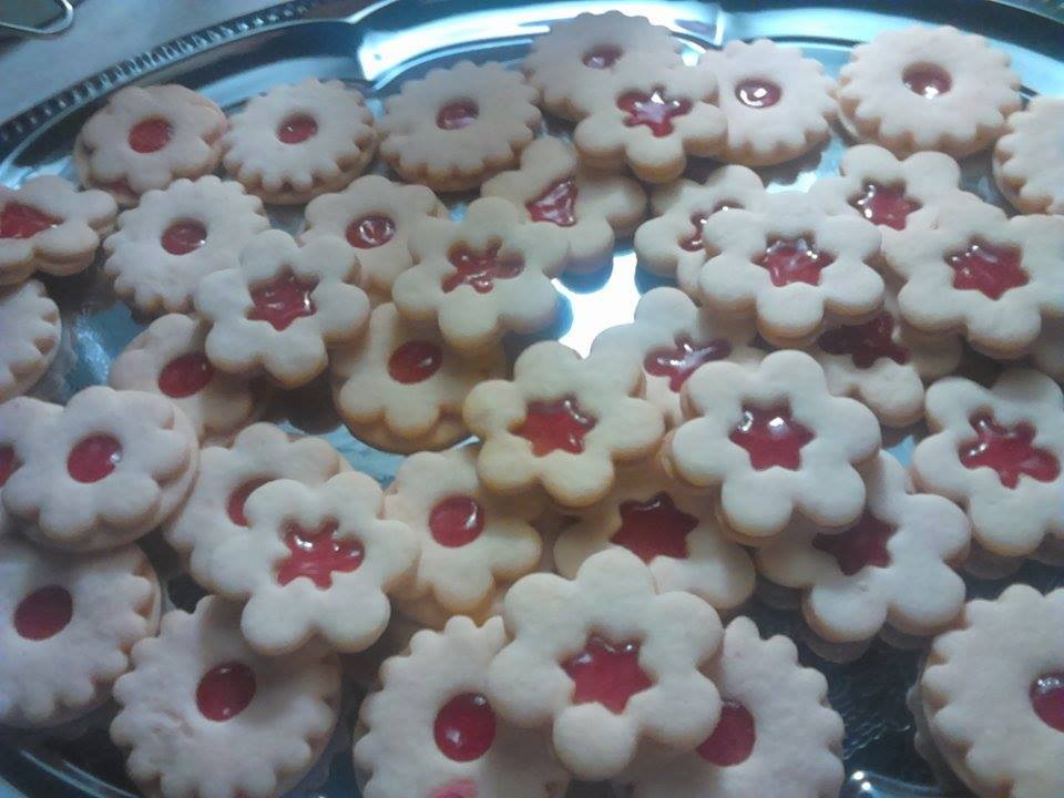 Po wyciągnięciu z lodówki wałkujemy ciasto na ok. 3-4 mm. Wycinamy wybrany kształt (kwiatki, serduszka, gwiazdki itp.). Układamy na blaszce i pieczemy ok. 8-10 min w piekarniku rozgrzanym do 180 stopni. Kiedy ostygną połowę z nich smarujemy wybranym nadzieniem.