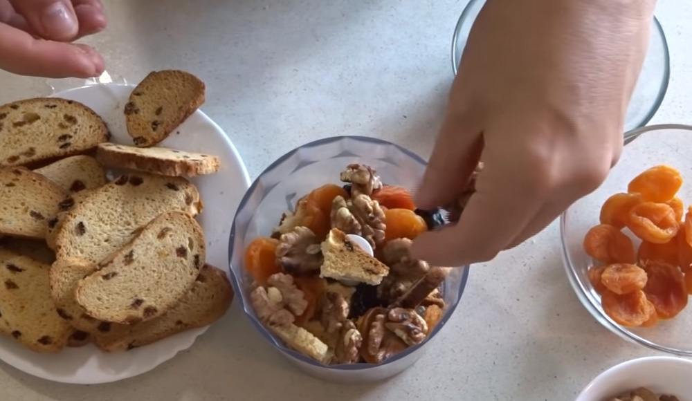 Zmiel drobno w blenderze herbatniki, śliwki, morele i orzechy. 70 g masła wymieszaj z 70 g czekolady. Rozpuść mieszaninę w kąpieli wodnej lub kuchence mikrofalowej.