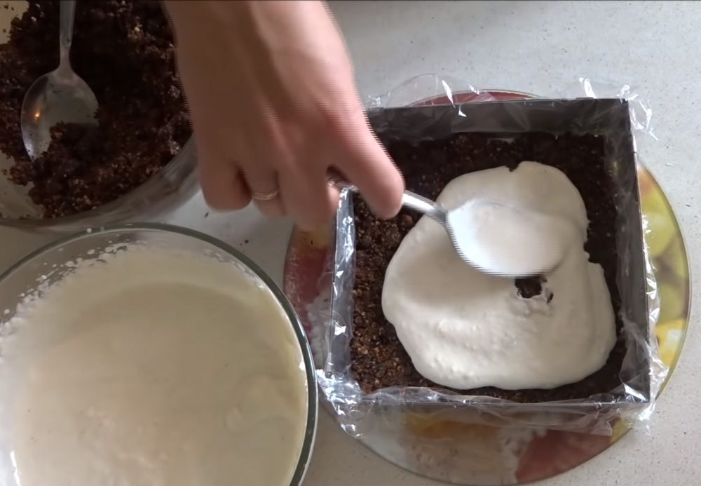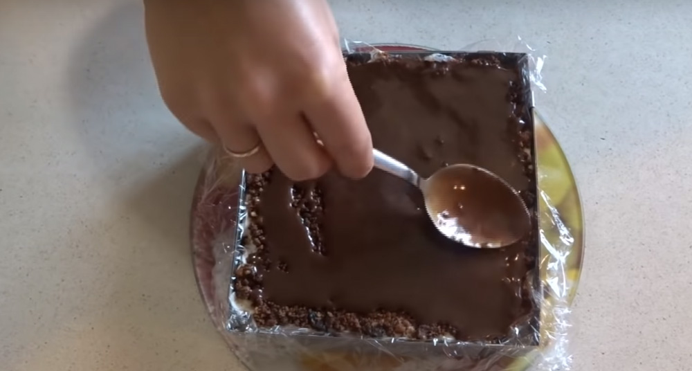 Weź formę i wyłóż ją folią spożywczą. Ułóż w niej ciasto, kładąc naprzemiennie cienką warstwę czekolady i warstwę śmietany. Ostatnią warstwę powinna tworzyć warstwa z herbatnikami. Wierzch ciasta przykryj folią spożywczą i włóż do lodówki na noc.
