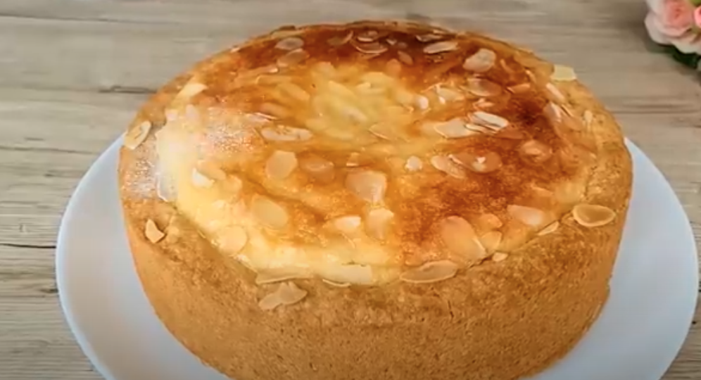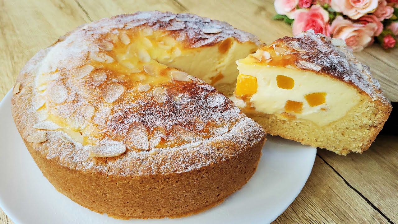Dodaj skrobię kukurydzianą i dokładnie wymieszaj. Dodaj kwaśną śmietanę lub jogurt grecki i miksuj, aż masa będzie gładka. Dodaj posiekane brzoskwinie lub morele i delikatnie wymieszaj. Wyjmij ciasto z zamrażarki i wylej na nie przygotowaną masę z nadzieniem. Posyp wierzch płatkami migdałowymi. Piecz w piekarniku nagrzanym do 170°C przez 50 minut. Po upieczeniu, pozwól ciastu ostygnąć. Udekoruj ciasto cukrem pudrem.