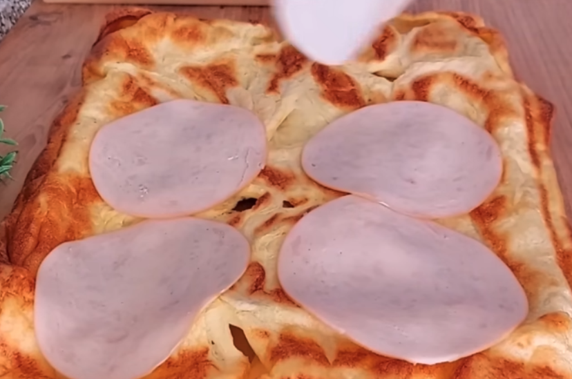 W dużej misce rozbij 5 jajek. Dodaj szczyptę soli do smaku. Dobrze wymieszaj jajka. Dodaj 2 szklanki mleka (400 ml) i 1,5 szklanki mąki (180 g). Mieszaj do uzyskania gładkiej konsystencji. Dodaj 1 łyżkę roztopionego masła i ponownie dobrze wymieszaj. Wylej masę na blachę wyłożoną papierem do pieczenia, równomiernie rozprowadzając. Wstaw do nagrzanego piekarnika na 180°C.