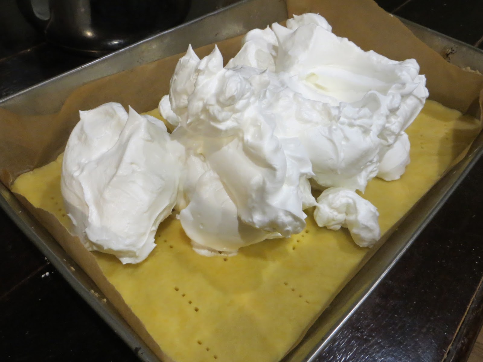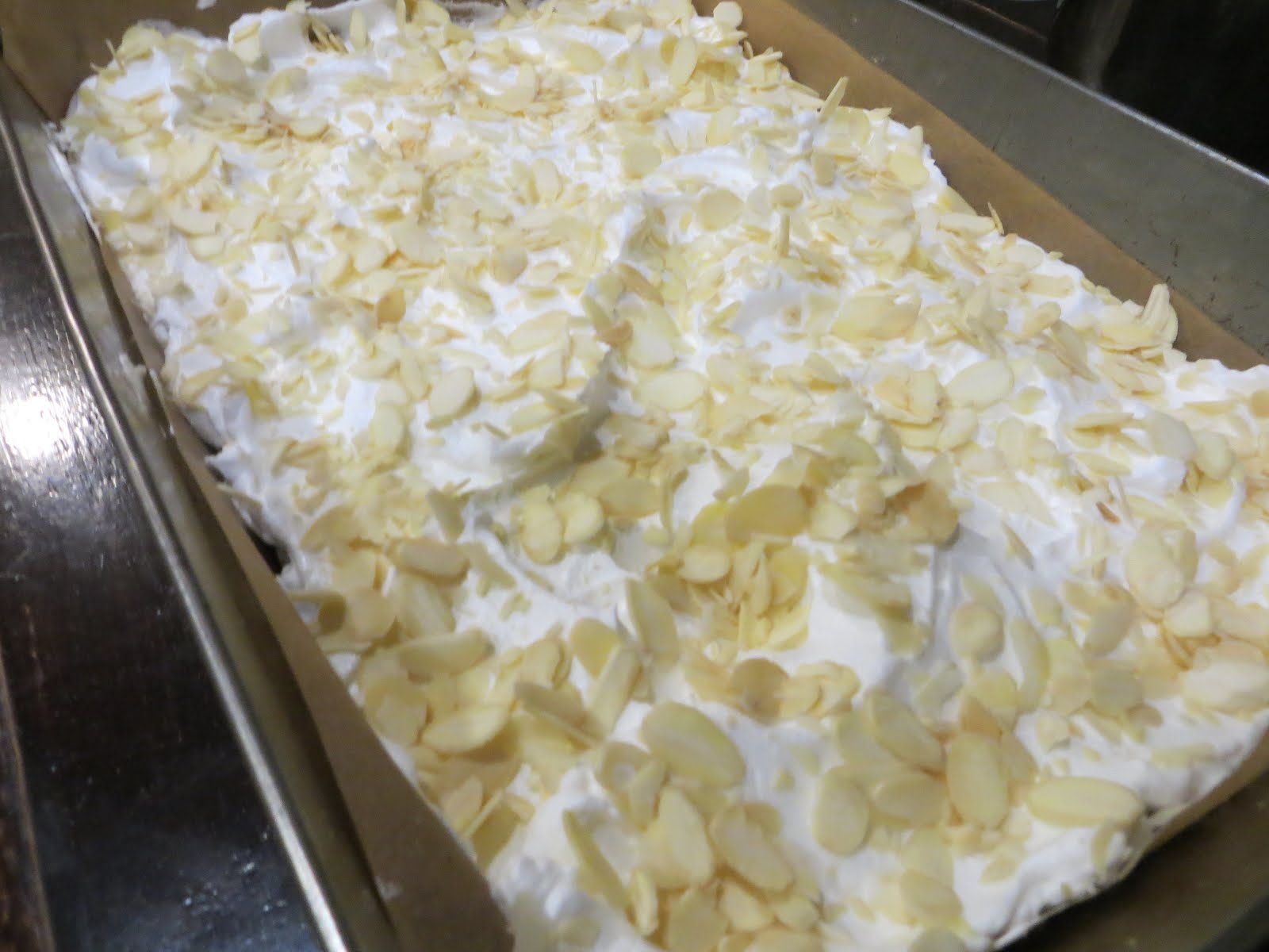 Białka ubij na sztywno z cukrem pudrem. Wyłóż je do blaszki z kruchym ciastem i wyrównaj. Wierzch posyp płatkami migdałowymi.