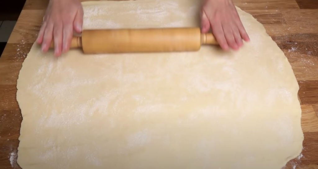 W międzyczasie przygotowujemy blat posypany mąką, Po upływie 30 minut ciasto wyciągamy z folii i kładziemy na deskę,