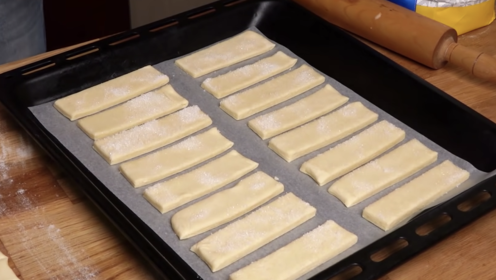 Sypiemy raz jeszcze cukrem i kroimy w paski, by finalnie przygotować je do pieczenia na blaszce, Pieczemy w rozgrzanym piekarniku i w 200 stopniach, przez 20 minut.