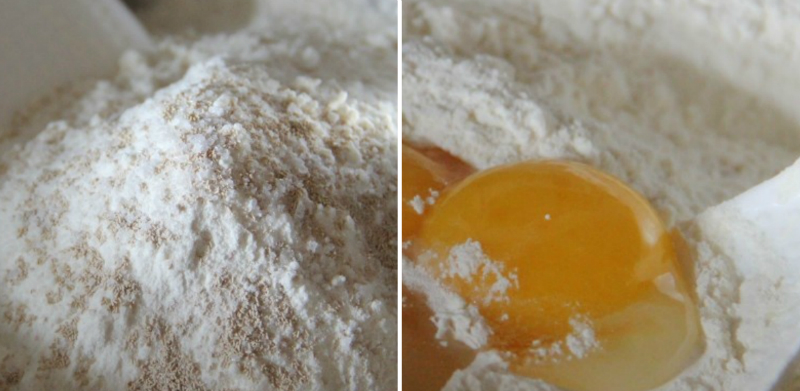 Suche składniki połącz ze sobą w misce i dodaj jajko. Do uzyskanej masy dodaj ciepłą wodę oraz olej roślinny. Raz jeszcze dokładnie wymieszaj.