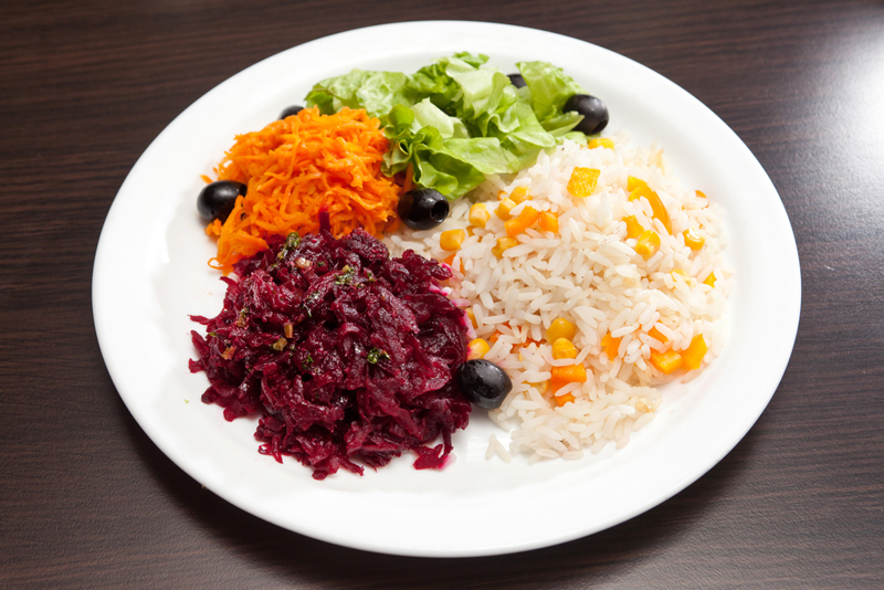Składniki: jeden ugotowany burak, jedna ugotowana marchewka, 150 g ugotowanego ryżu, jedna łyżka kukurydzy z puszki, osiem oliwek, jedna łyżka oliwy z oliwek, jedna łyżeczka sosu sojowego, jak również pół łyżeczki octu jabłkowego oraz świeże zioła.