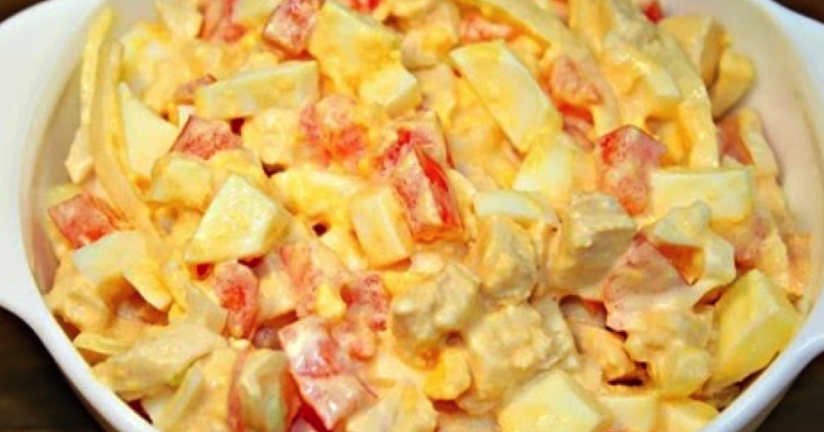 Jajka gotujemy na twardo. Cebulę kroimy w cienkie pierścienie lub półpierścienie. Mieszamy ją z cukrem i octem. Odstawiamy do zamarynowania. Pomidora i jajko kroimy w drobną kostkę. Kurczaka gotujemy w osolonej wodzie. Studzimy i kroimy na małe kawałki. Kurczaka można także upiec.