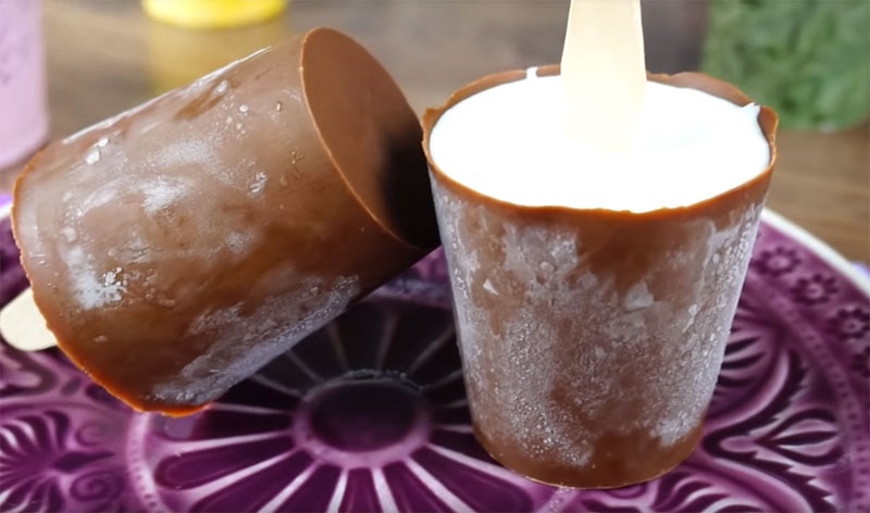 Napełnij kubeczki masą lodową i do każdego włóż patyczek. Włóż do zamrażarki przynajmniej na 5 godzin.