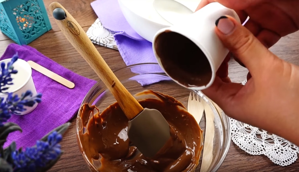 Następnie przygotuj papierowe kubeczki. Napełnij każdy czekoladą na ściankach, uważaj, aby nie było jej za dużo – wystarczy Ci cienka warstwa.