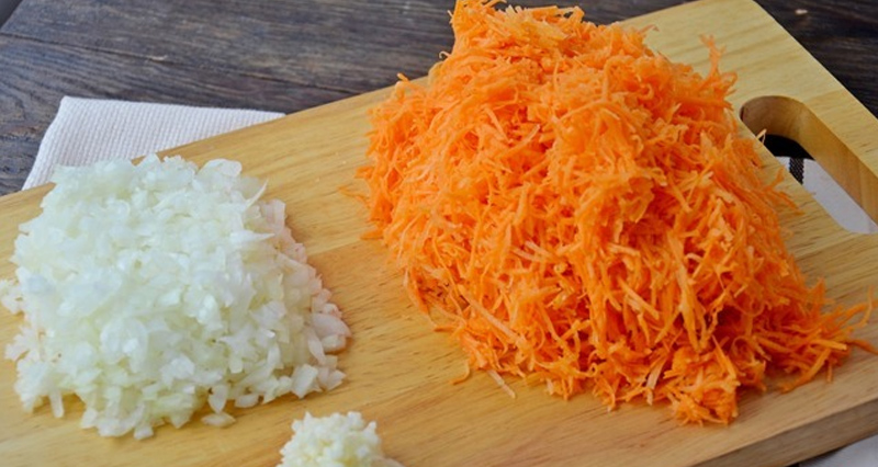Warzywa obierz i umyj pod bieżącą wodą. Marchewkę zetrzyj na tarce o grubych oczkach. Cebulkę pokrój w drobną kostkę.