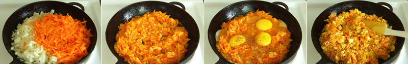Na rozgrzaną patelnię przełóż przygotowaną marchew i cebulę, zamieszaj i przykryj pokrywką. Całość smaż przez 15 minut na małym ogniu, co jakiś czas mieszając, aby nie doszło do przypalenia. Dodaj kilka łyżek wody.