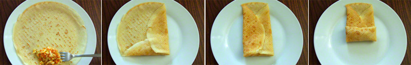 Na przygotowane wcześniej naleśniki umieść około 2 łyżki farszu, ciasto zwiń w kopertę lub zawiń.