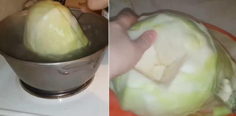 Przygotowanie podstawy gołąbków rozpocznij standardowo, tak jak w przypadku naszej polskiej receptury. Gotuj kapustę w wodzie, ostrożnie i powoli oddzielając kolejne liście od siebie.