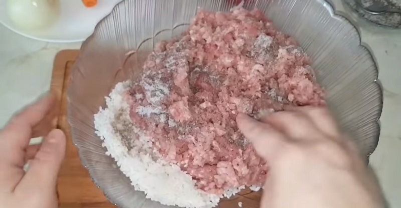 Teraz czas na farsz – ryż zalej wrzącą wodą i dokładnie go opłucz. Do ryżu dodaj mielone mięso. Dodaj do farszu wszystkie przyprawy, np. sól, pieprz i wszystko dokładnie wymieszaj.