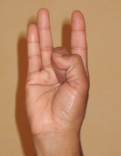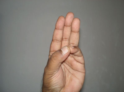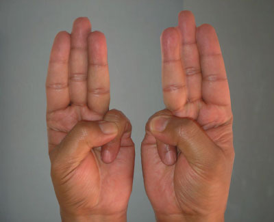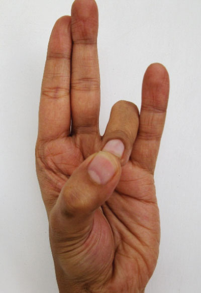 Aby wykonać tę mudrę należy zgiąć środkowy palec, a w następnej kolejności docisnąć go kciukiem. O ile jesteśmy w stanie, dobrze byłoby resztę palców wyprostować.