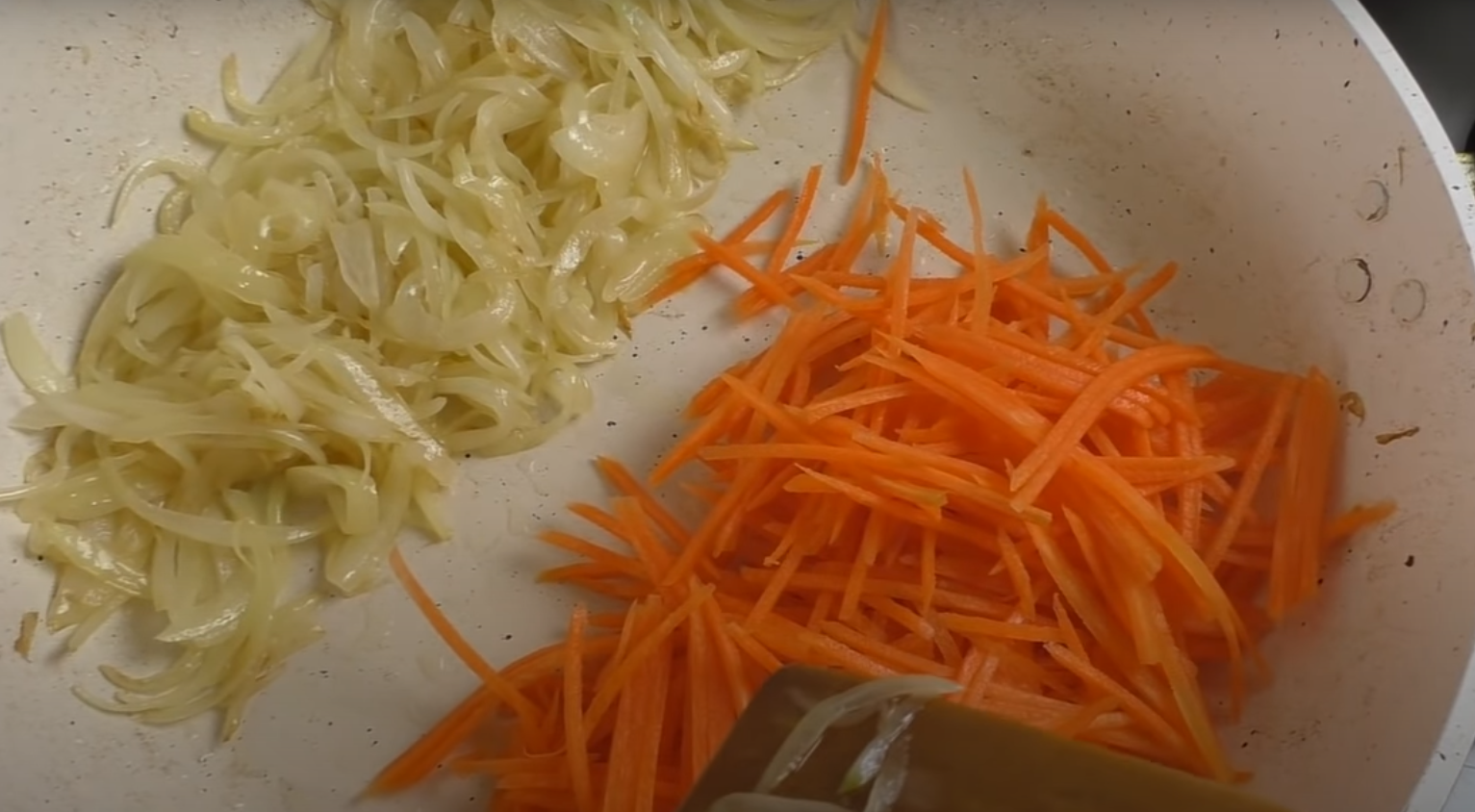 Marchew i cebulę pokrój w drobne paseczki. Smaż warzywa na rozgrzanej patelni, ale nie mieszaj ich ze sobą!