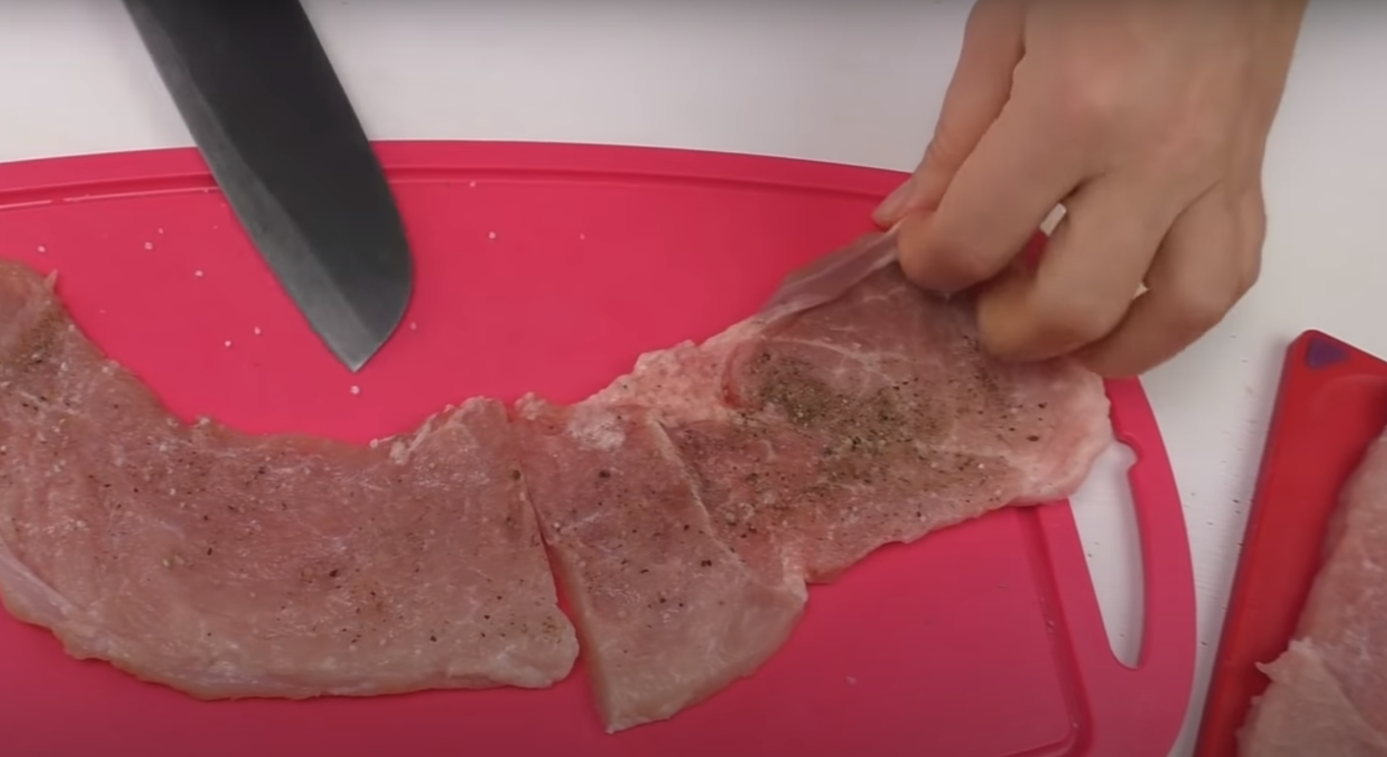 Mięso pokrój na kawałki i okryj folią spożywczą. Rozbij je na dość cienkie, długie plastry. Z obu stron dopraw solą i pieprzem.