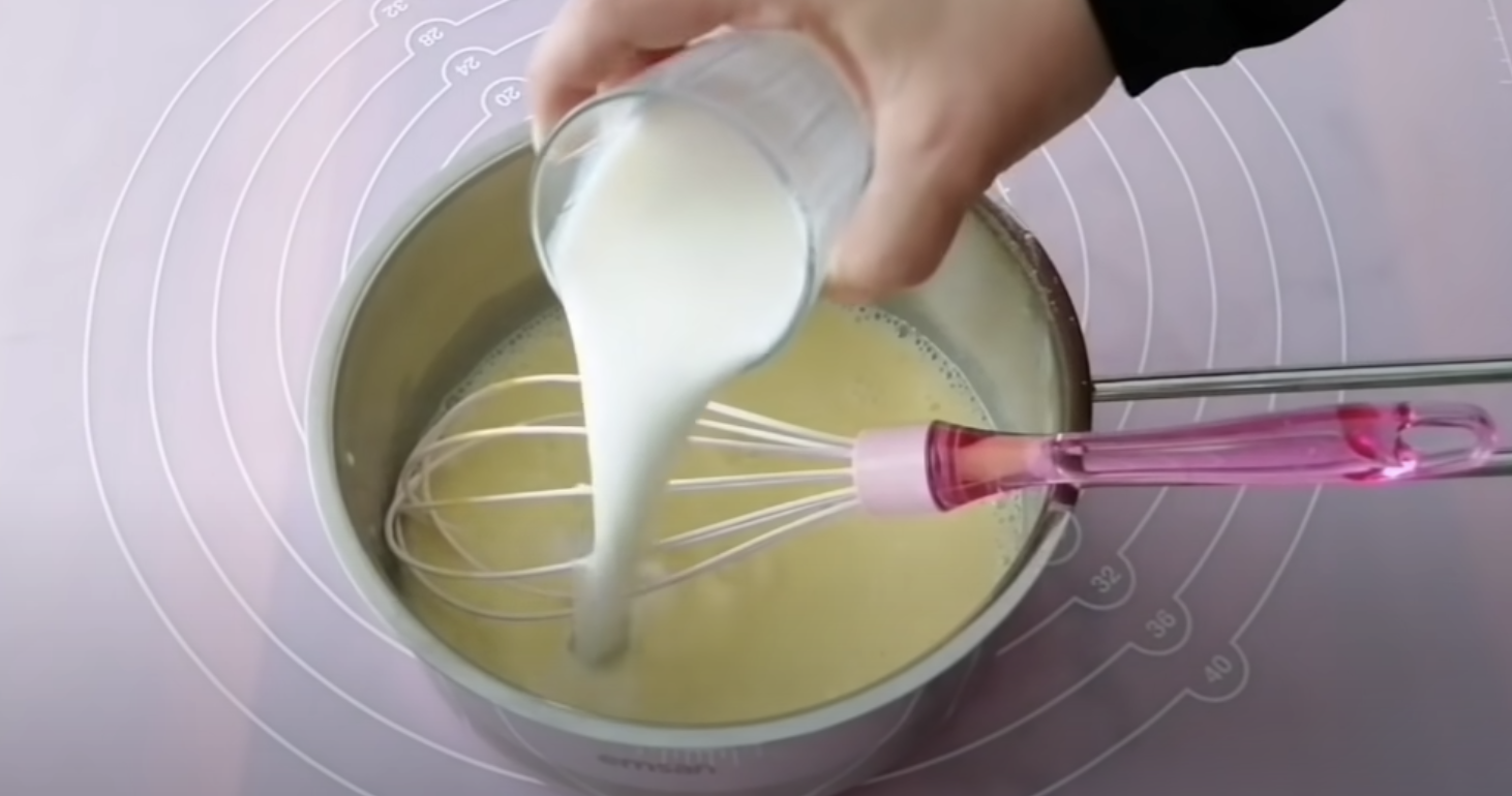 Na początku zajmiemy się przygotowaniem kremu – do małego garnuszka wlej trochę mleka, wbij jajko oraz wsyp trochę cukru i skrobię.
