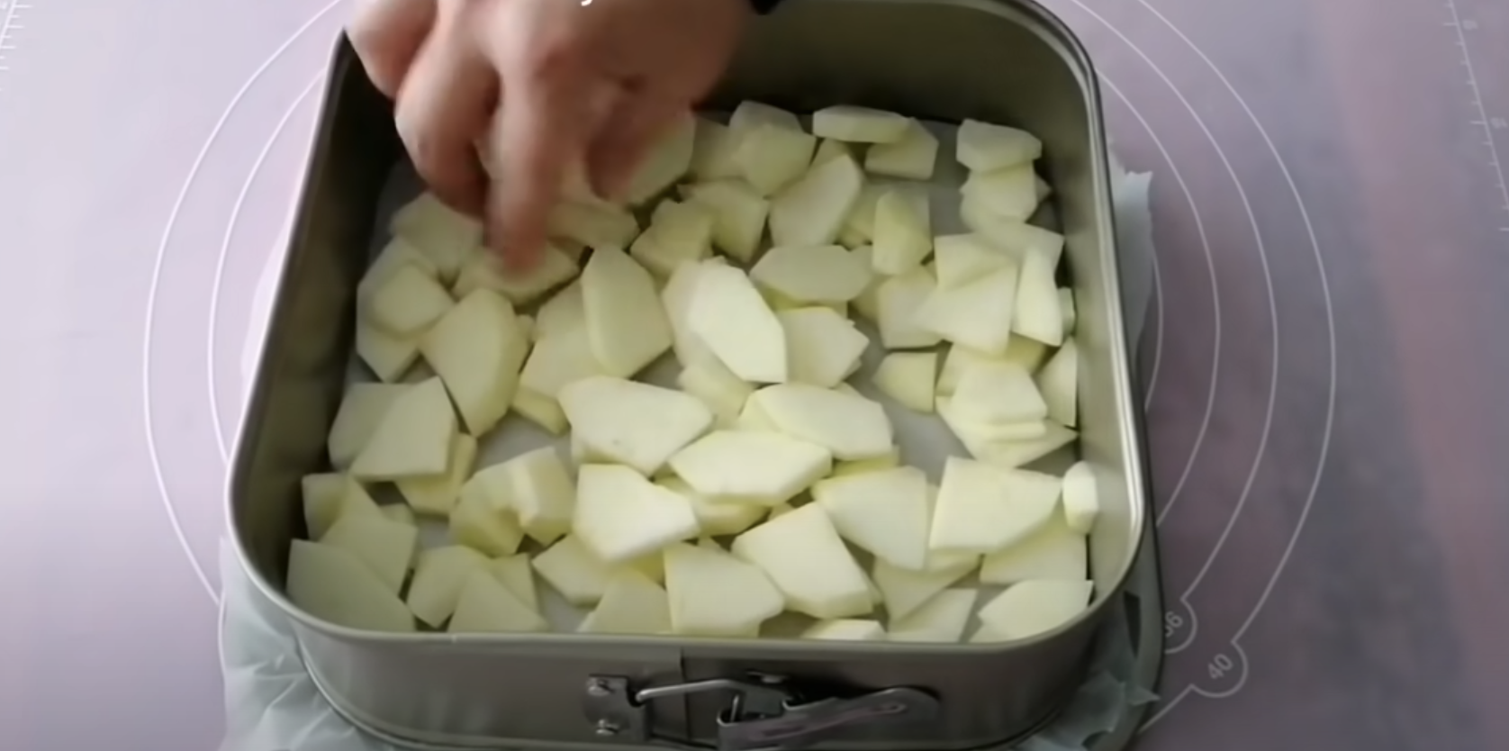 Należy je pokroić na małe kawałeczki, a przygotowaną formę posmarować masłem. Następnie rozłóż fragmenty na dnie blachy.