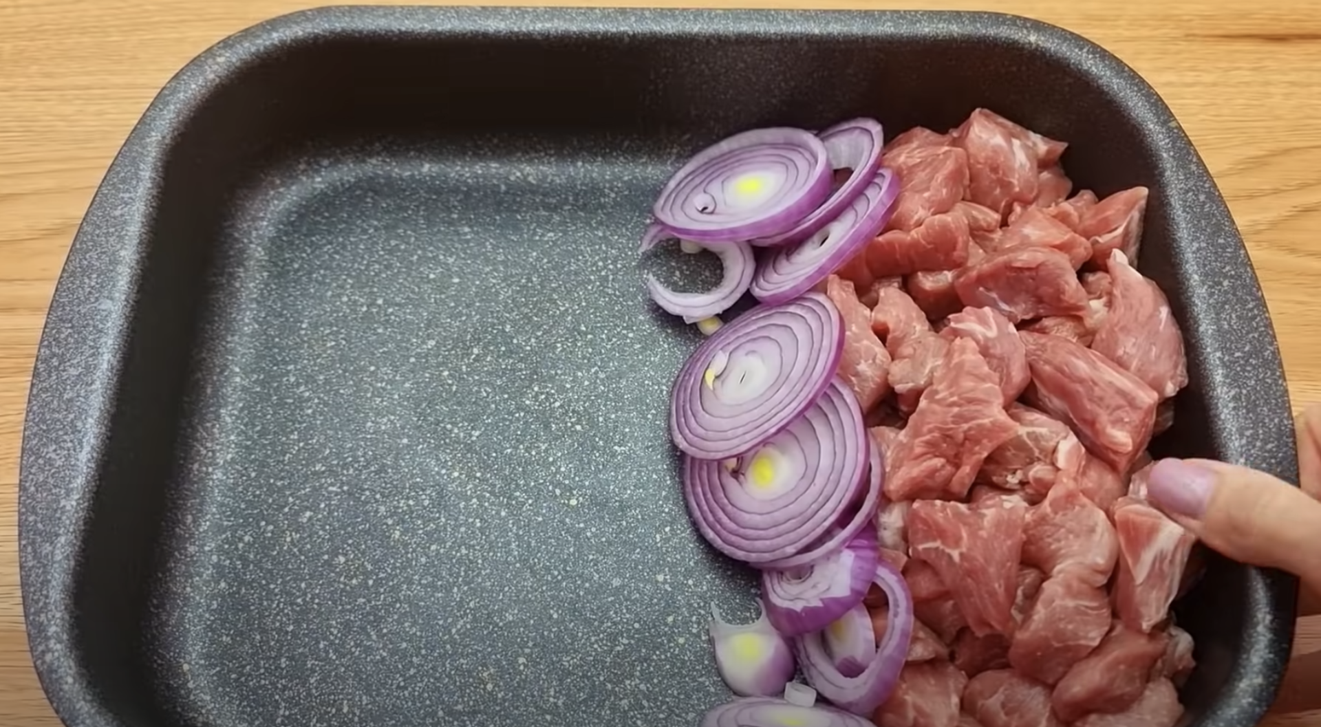Cebulę kroimy w w krążki, układamy obok mięsa.