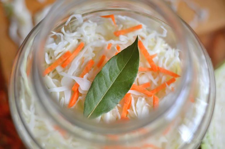 Następnie układaj kolejne warstwy aż do całkowitego zapełnienia słoja. Na wierzchu połóż kolejny liść laurowy. Ubij kapustę a następnie zalej zimną solanką. W czasie fermentacji zalewa może wypłynąć ze słoika, dlatego umieść go w większej misce.