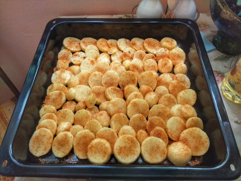 Na początku przygotowujemy marynatę z oleju, przyprawy do gyrosa, miodu i piwa. Następnie kładziemy ziemniaki pokrojone w plasterki na tacy i smarujemy cienką warstwą marynaty. Resztę używamy do zamarynowania mięsa.