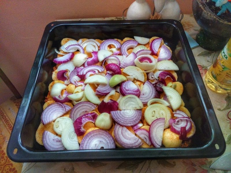 Kroimy cebulę w krążki i równomiernie rozkładamy na ziemniakach. To samo robimy z pokrojonym w kostkę boczkiem.