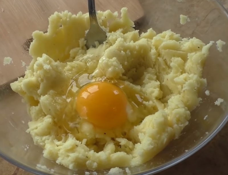 Do drugiej miski przełóż pure ziemniaczane, dodaj masło oraz jajko. Analogicznie wszystko dopraw solą oraz pieprzem, a później dokładnie wymieszaj, aż do uzyskania jednolitej masy.