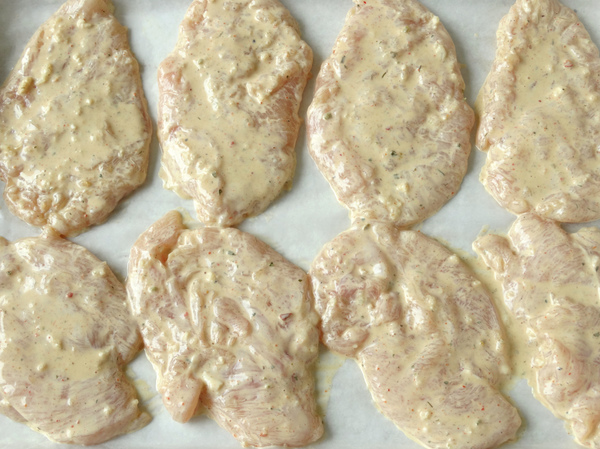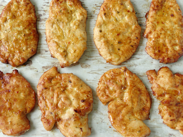 Po tym czasie wyłożyć je na blaszkę, która jest wyłożona pergaminem. Położyć kotlety w lekkich odstępach od siebie i zalać jeszcze marynatą, która pozostała w misce.