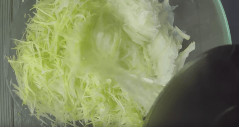 Kapustę i cebulę zetrzyj na tarce o grubych oczkach. Jeżeli nie masz tarki, możesz wszystko posiekać drobno za pomocą noża.