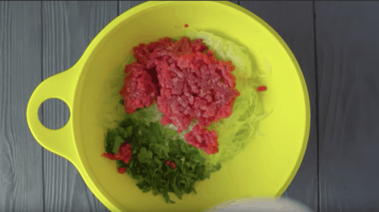 Składniki umieść w głębokiej misce i zalej wrzątkiem na 2 minuty. Po upływie tego czasu odcedź warzywa. Dodaj drobno pokrojoną pietruszkę i mielone mięso.