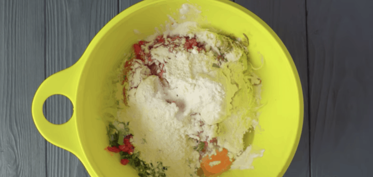 Następnie wbij jajko i dodaj kwaśną śmietanę. Jeżeli aktualnie nie masz w lodówce śmietany, możesz zastąpić ją gęstym majonezem. Kolejno dodawaj sól, pieprz, mąkę oraz sodę oczyszczoną. Wszystko dokładnie wymieszaj.