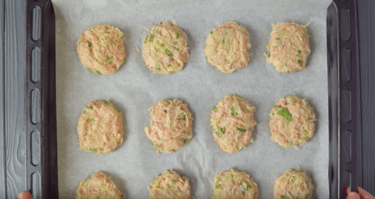 Z powstałej masy uformuj małe kotleciki i umieść je na blaszce wyłożonej papierem do pieczenia. Piecz przez 30 minut w temperaturze 200 stopni Celsjusza, aż kotleciki nabiorą rumianego koloru.
