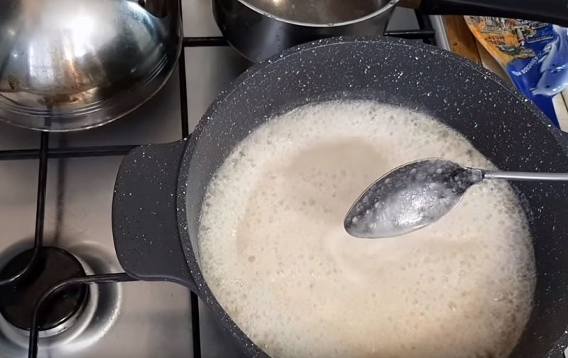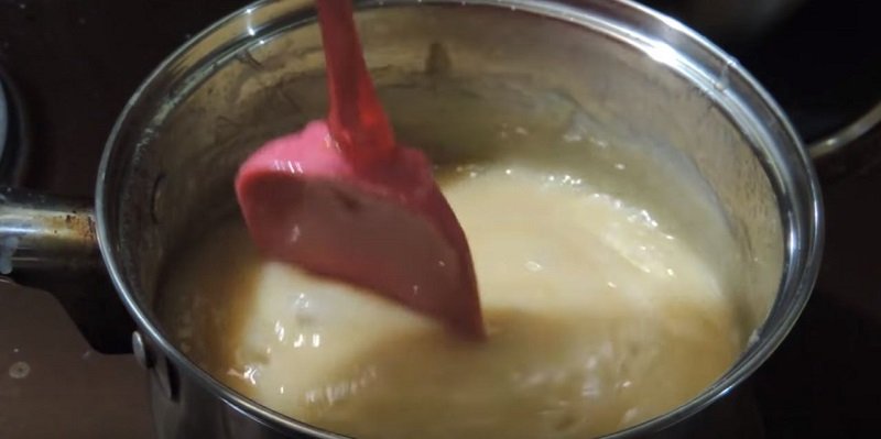 Kiedy cukier zmieni konsystencję niezwłocznie dodajemy masło i zwiększając moc palnika mieszamy by nie doprowadzić do przypalenia. Kiedy składniki dobrze się połączą wlewamy do nich podgrzane uprzednio mleko. Całość mieszamy dokładnie i po kilku minutach gotowania zdejmujemy z ognia.