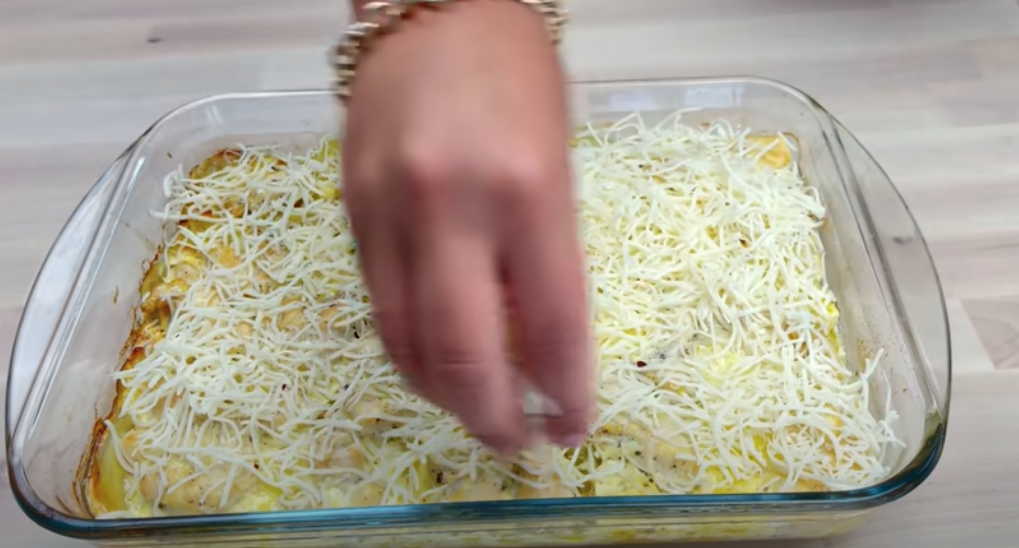 Wlać przygotowaną śmietanę na naczynie z ziemniakami, cebulą i kurczakiem. Przykryć naczynie arkuszem papieru do pieczenia, a następnie folią aluminiową. Piec przez 30 minut w piekarniku nagrzanym do 180°C. W tym czasie pokroić pomidora (opcjonalnie). Po 30 minutach pieczenia, posypać danie tartym serem mozzarella. Dodać pokrojone pomidory na wierzch. Skropić oliwą z oliwek i posypać ziołami prowansalskimi. Dokończyć pieczenie w piekarniku przez kolejne 10 minut.