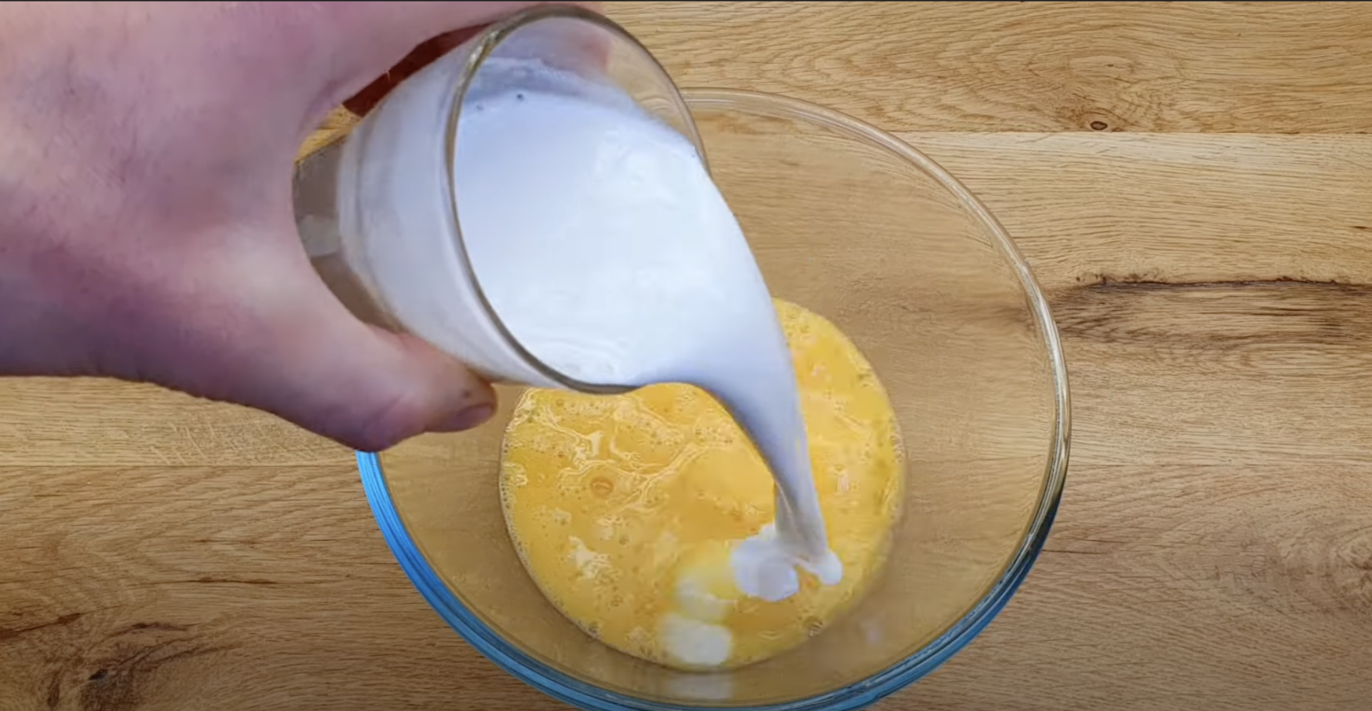Jajka wbij do miski, dolej śmietanę, dodaj ząbek czosnku (pokrojony lub przeciśnięty przez praskę), całość połącz z przyprawami i dokładnie wymieszaj.