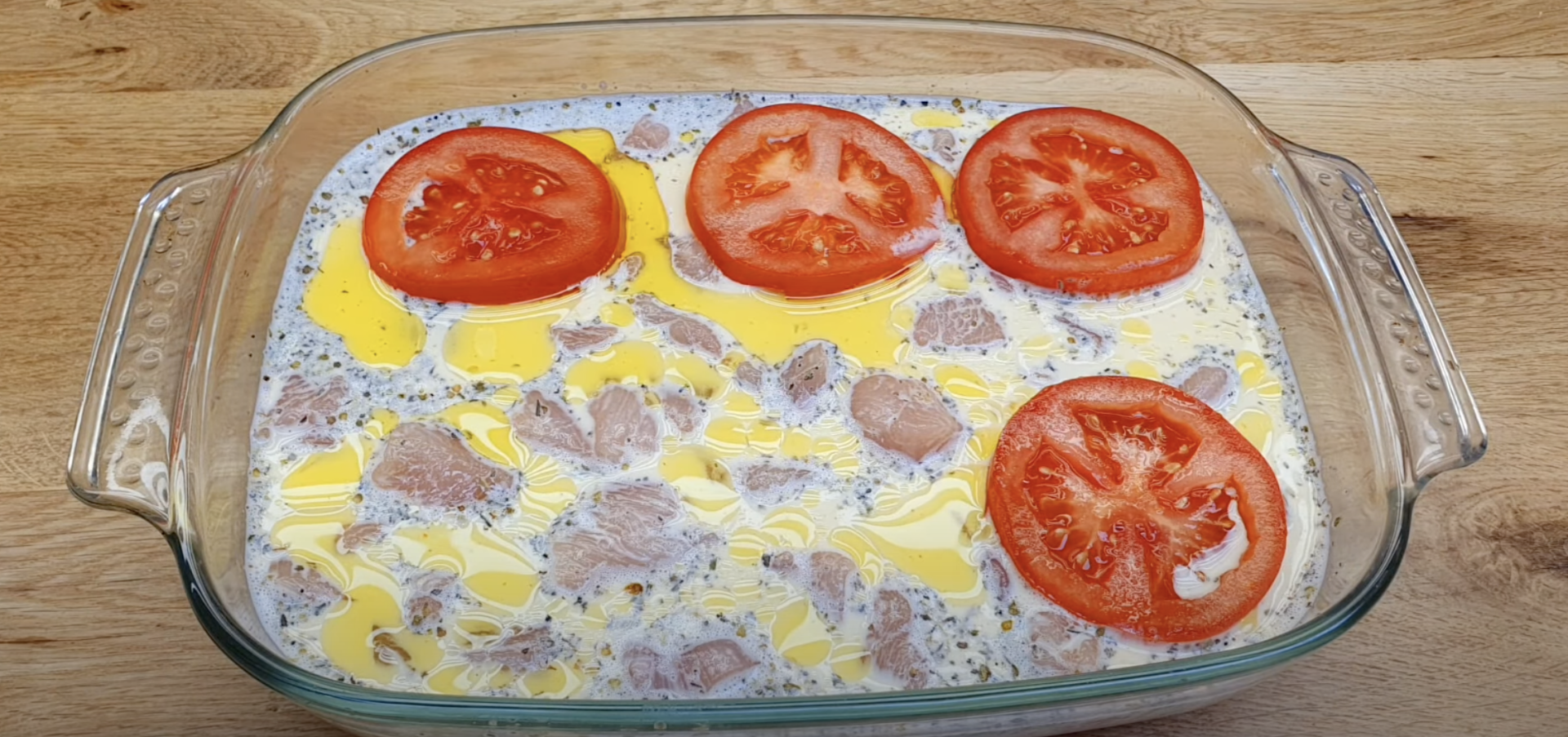 Tak przygotowaną masę wlej do naczynia żaroodpornego przykrywając nią dokładnie kurczaka. Całość skrop delikatnie oliwą z oliwek.