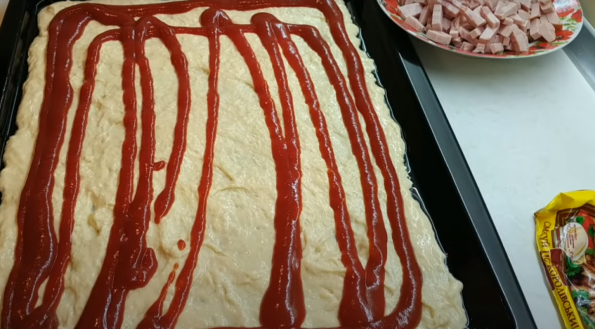 Na końcu ułożyć swoje ulubione dodatki takie jak: szynka, ser, pieczarki.