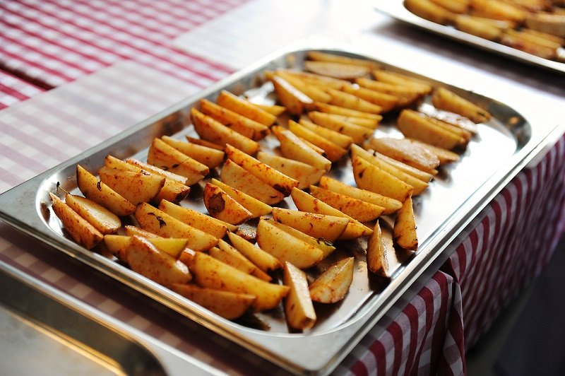 Blaszkę smarujemy olejem słonecznikowym i rozkładamy na jej powierzchni wcześniej przygotowane ziemniaki. Pilnujemy by były między nimi delikatne odstępy. Pieczemy je w temperaturze 200 stopni przez około 15 do 20 minut.