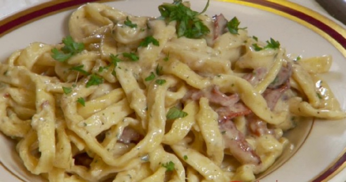 Pierwszym krokiem jest ugotowanie makaronu tak, aby był on miękki. Cebulę i boczek (szynkę) należy pokroić. Składniki trzeba usmażyć na patelni, dodając do nich serek topiony. Smażymy tak długo, aż serek delikatnie się rozpuści. Do tej mieszanki dodajemy śmietanę i czosnek, który powinien zostać przeciśnięty przez praskę.