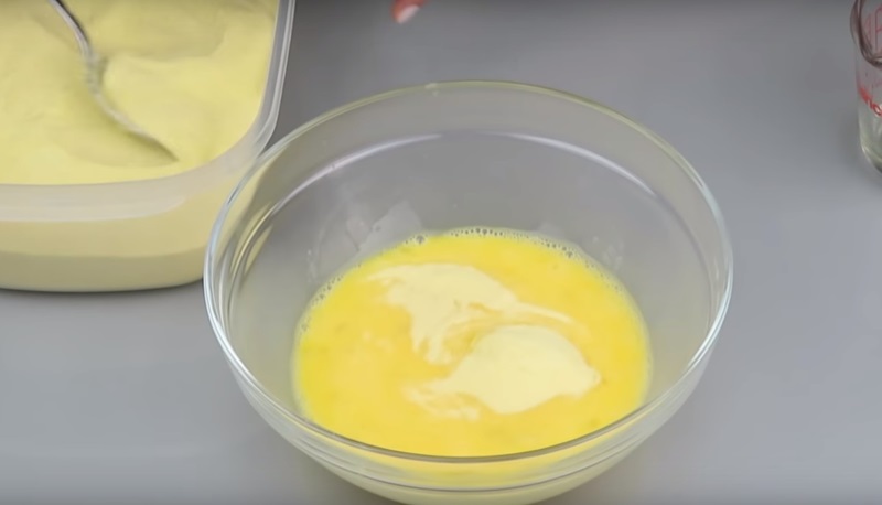 Jajka wbijamy do miski i dokładnie je ubijamy za pomocą ręcznej trzepaczki. Następnie do jajek dodajemy kaszą manną, mieszamy składniki i odstawiamy całość na około 5 minut.