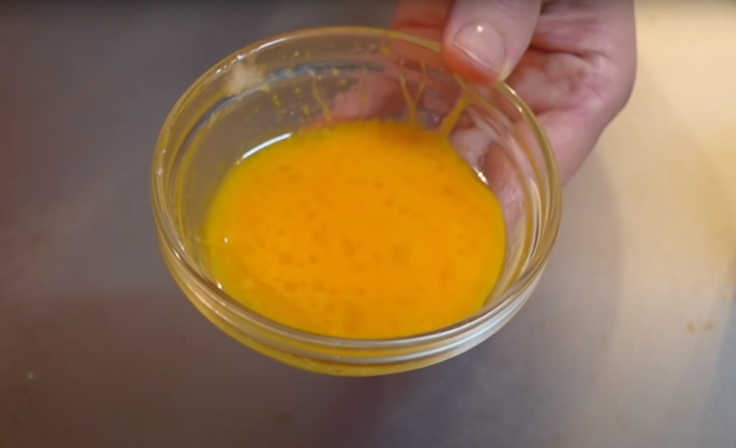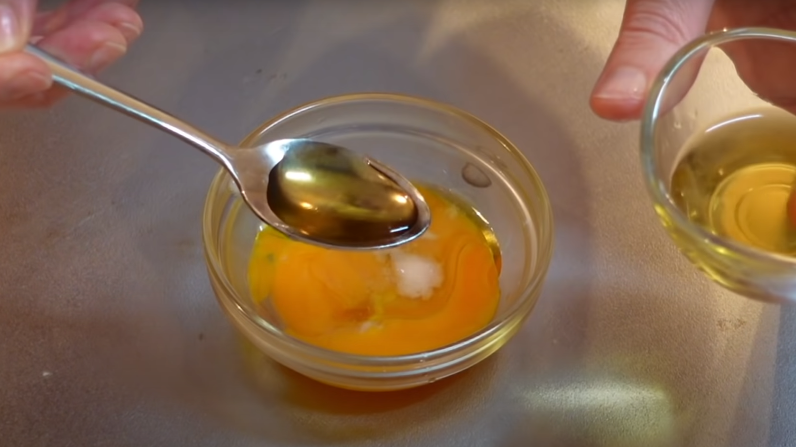 Rozbij jajko i oddziel żółtko od białka. Przełóż żółtko do miski, dodaj oliwę, miód, olej kokosowy i dobrze wymieszaj. Na koniec dodaj wywar z rumianku.