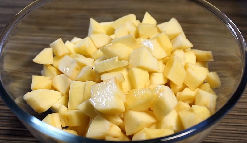Jabłka umyj, obierz i pokrój na niewielkie kawałki. Owoce skrop sokiem z cytryny, wymieszaj i odstaw. W międzyczasie nagrzej piekarnik do 180 stopni.