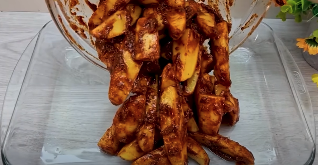 Zrób wcięcia w mięsie. W misce wymieszaj 5-7 ząbków czosnku (drobno posiekanych), 3 łyżki koncentratu pomidorowego, 7 łyżek sosu sojowego, 3 łyżki oliwy z oliwek, 1/2 łyżeczki cukru oraz przyprawy (pieprz czarny, papryka, kolendra, bazylia) do smaku. Obierz i pokrój 1000-1300 gramów ziemniaków na kawałki. Dodaj ziemniaki do miski z przygotowanym sosem i wszystko dobrze wymieszaj.