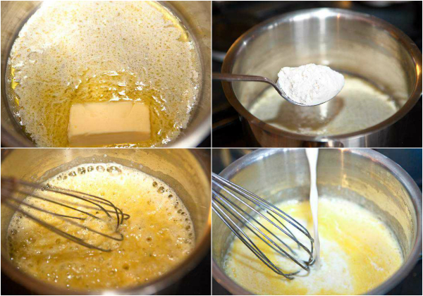 Pierwszym krokiem powinno być obranie ziemniaków i ugotowanie ich (koniecznie na półtwardo) w lekko osolonej wodzie. W czasie gotowania możemy z kolei wziąć się za przygotowanie sosu. Na początku należy w rondelku rozpuścić masło z dodatkiem mąki. Przez cały czas mieszając, by zapobiec tworzeniu się grudek lub przypaleniu.