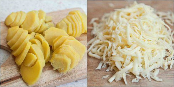 Biała piana, która po czasie zacznie pojawiać się na powierzchni będzie dla nas sygnałem, że czas do mieszaniny dodać mleko oraz sól. Sos podgrzewaj aż doprowadzisz do wrzenia, następnie zestaw z ognia. Mięso pokrój na kawałki, cebulę w pierścienie, a ziemniaki w plastry. Ser zetrzyj na tarce o drobnych oczkach.