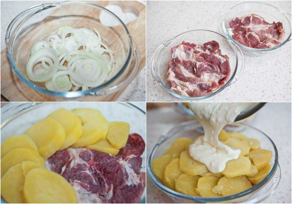 Po przygotowaniu wszystkich składników formę do pieczenia (najlepiej naczynie żaroodporne) dokładnie wysmaruj olejem roślinnym. Ułóż w niej warstwę cebuli, w drugiej kolejności przyprawione mięso oraz ziemniaki.