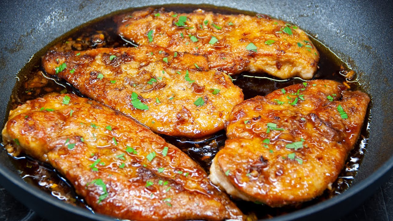 Smaż 100 g umytego ryżu przez 1 minutę w oleju roślinnym. Dodaj 200 ml wody, sól i gotuj na małym ogniu przez 20 minut. Pokrój 2 piersi z kurczaka wzdłuż. Posmaruj olejem z obu stron, dopraw solą i pieprzem. Obtocz kurczaka w mące z obu stron. Rozpuść 30 g masła na patelni. Smaż filet z kurczaka z obu stron przez 2-3 minuty, aż będzie złocisty. Zmiel 5 ząbków czosnku. Na patelni rozpuść pozostałe 30 g masła. Dodaj czosnek i paprykę, smaż przez 1 minutę. Dodaj 60 g miodu, 2 łyżki sosu ostrygowego, 2 łyżki sosu sojowego, 1 łyżkę octu i 30 ml wody. Wymieszaj wszystko razem. Umieść smażony filet z kurczaka na patelni z sosem. Smaż przez 1-2 minuty, polewając kurczaka sosem. Udekoruj posiekaną natką pietruszki.