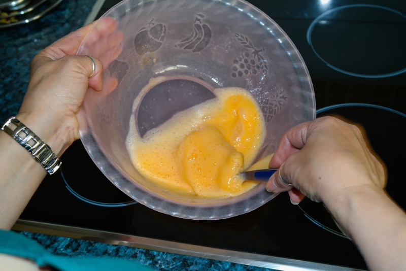 Najpierw piec jajek należy roztrzepać trzepaczką lub widelcem. Dodać do nich cukier, według uznania.